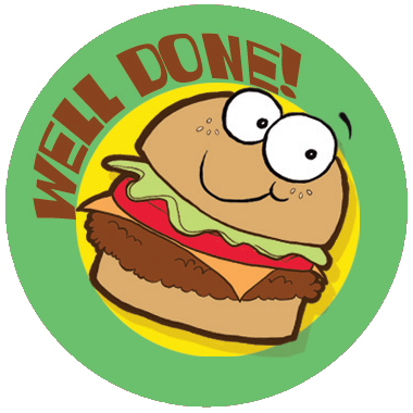Each package of Dr. Stinky's Scratch-N-Sniff Stickers contains 26 scented stickers (2 sheets) and 1 Limited Edition Sticker (hidden in sticker pack!). Sticker sizes range from .75" round to 1.25" round plus one large 3.5" sticker. These Hamburger scented stickers say "WELL DONE!"