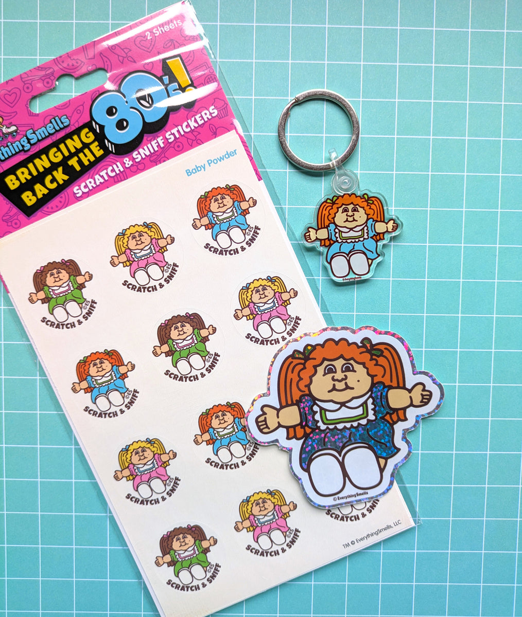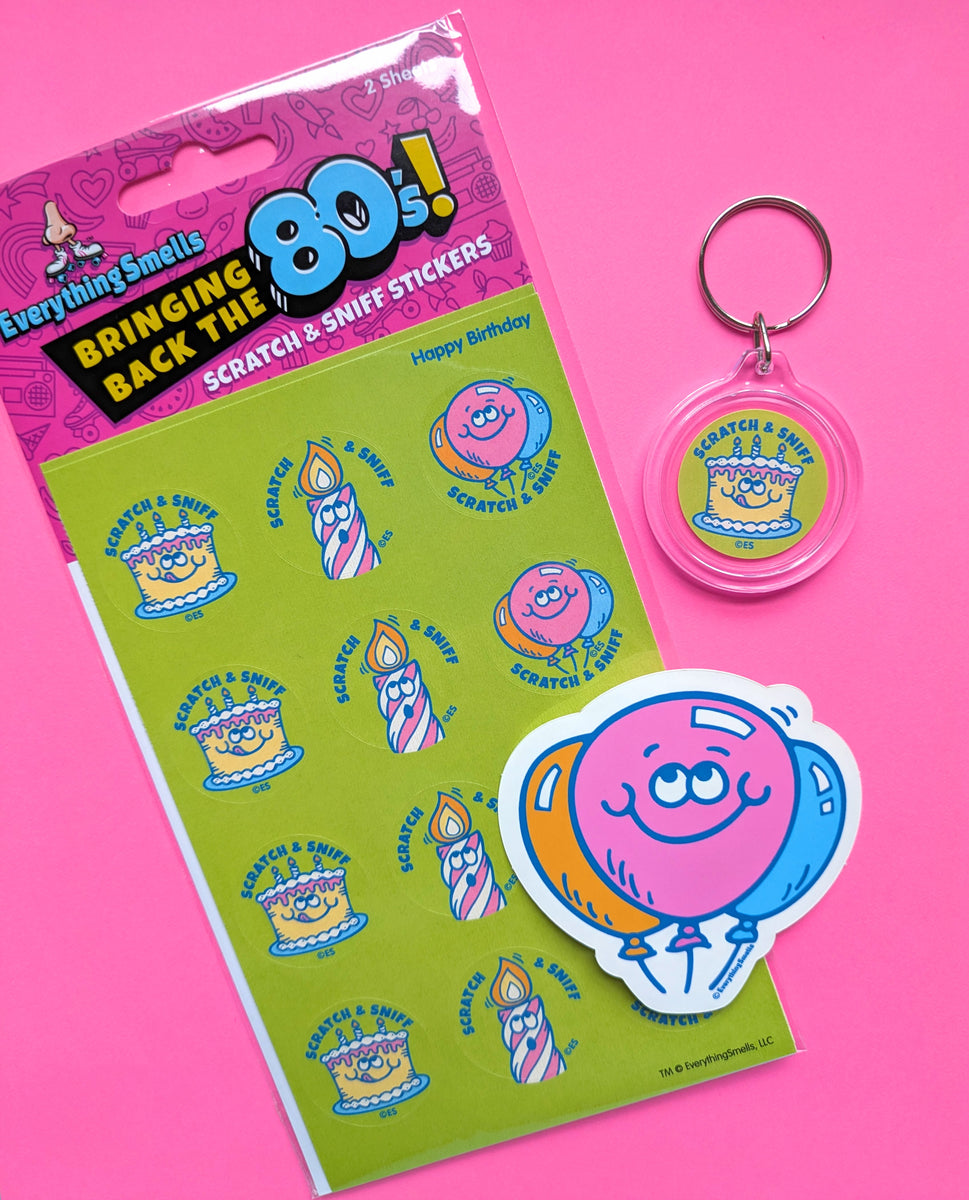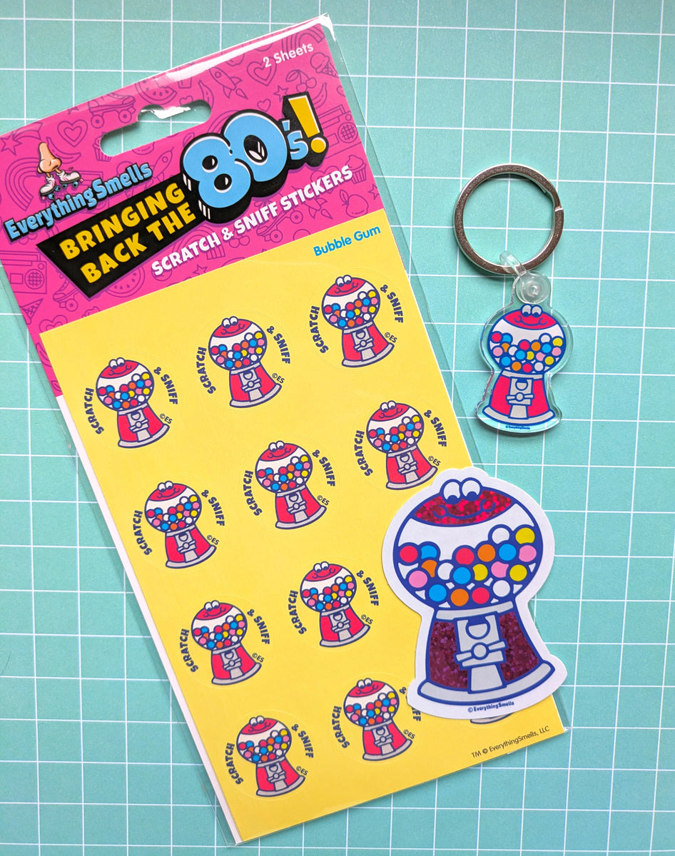 - Gift packs contain a full pack of my scratch and sniff stickers (2 sheets), matching vinyl sticker (unscented), and matching keychain. See photos.