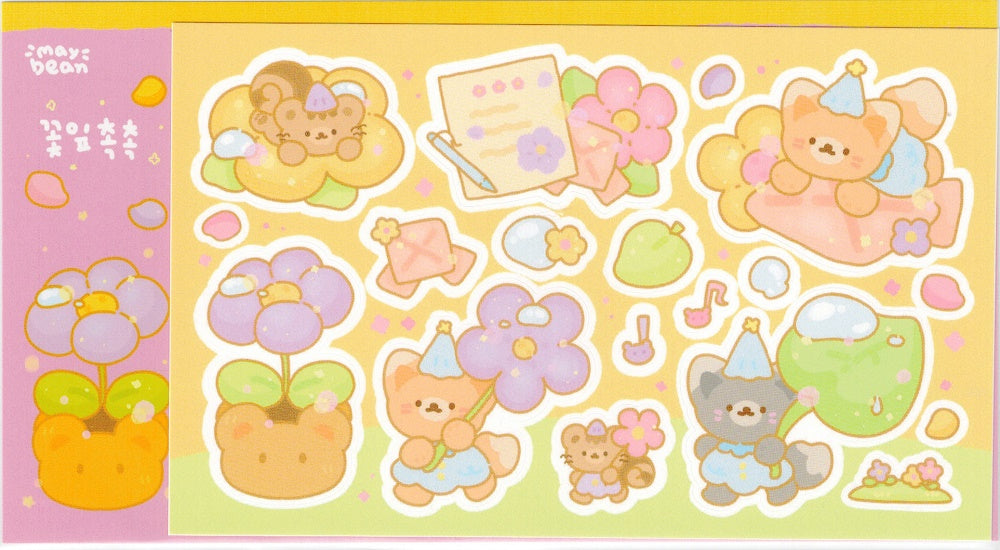 I reached out to my favorite Korean sticker designers and am delighted to offer you these authentic Korean stickers made by Maybean. They are matte vinyl and feature the cutest characters with the loveliest colors. On this sheet Red and Gray Foxes are using flowers and leaves as umbrellas with their squirrel friends.