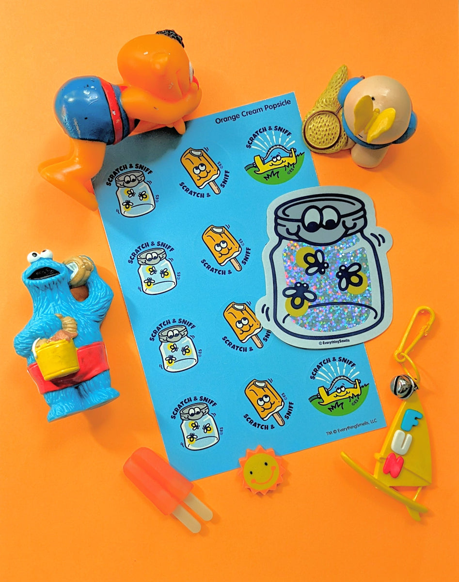 Memories of 1980's Summers spent cooling off in the sprinkler, chasing the ice cream truck, and catching fireflies in jars. These 3 things I make sure are a staple for my daughter every summer. Scratch and Sniff Orange Cream Popsicle scent...delish!