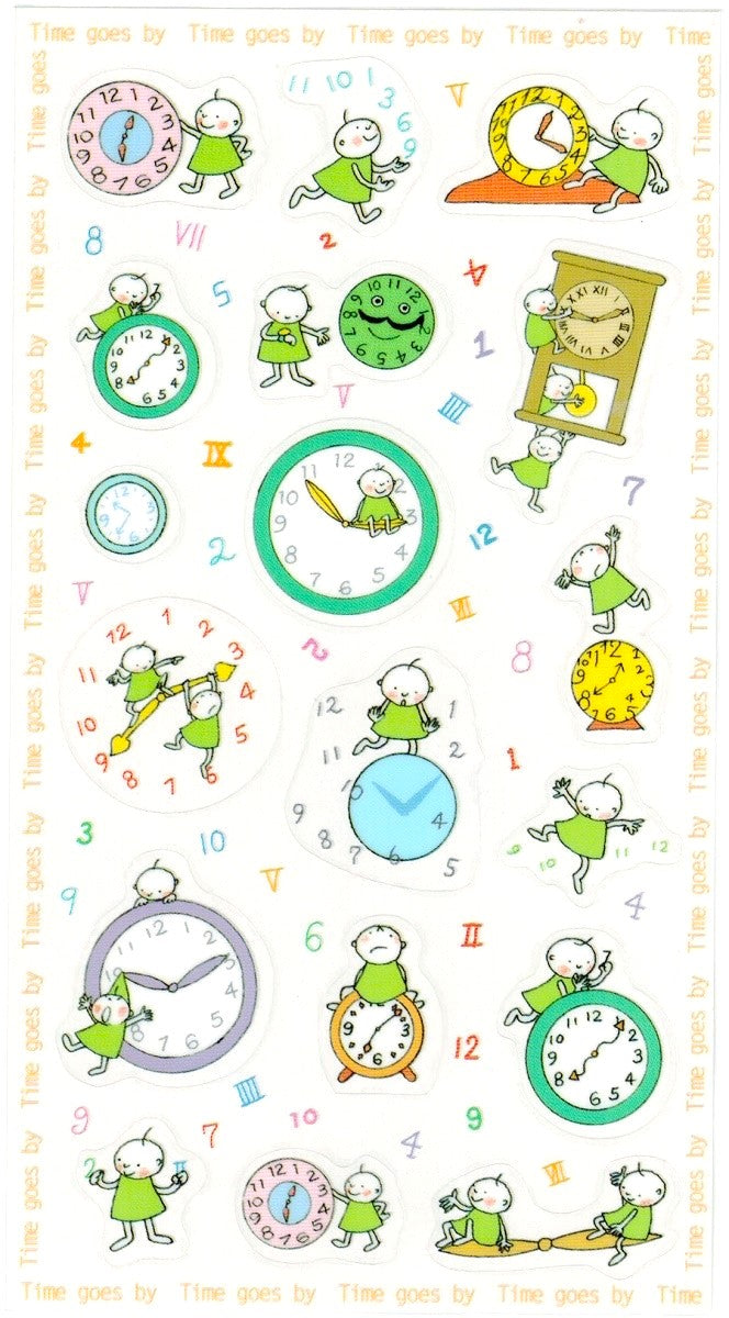 Made in Japan, these stickers of clocks and babies are fun to use "any time."