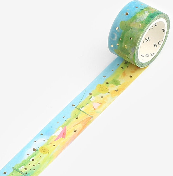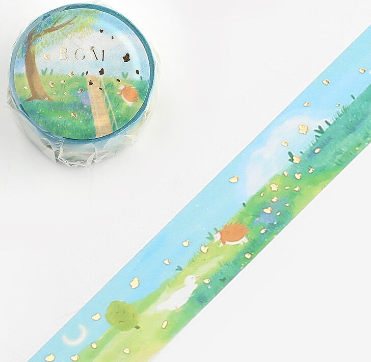 This washi unrolls to reveal hedgehog's gorgeous backyard where he plays with duck in the lush summer grass with a blue sky with gold foil accents. Washi tape, or masking tape, is a decorative tape that can be used to decorate planners, calendars, envelopes, sticker books - even to hang paper on a wall without ruining the paint. Washi tape is easily removed without any residue.