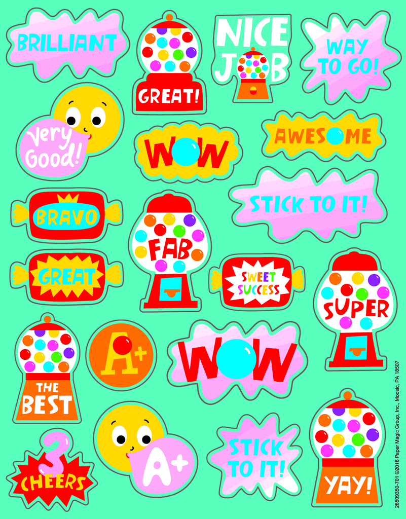 Each pack contains 4 sheets, 80 Bubble Gum scented, self-adhesive stickers. Each sticker measures 1" in diameter and are die-cut. Kids can never have too many scratch and sniff stickers!