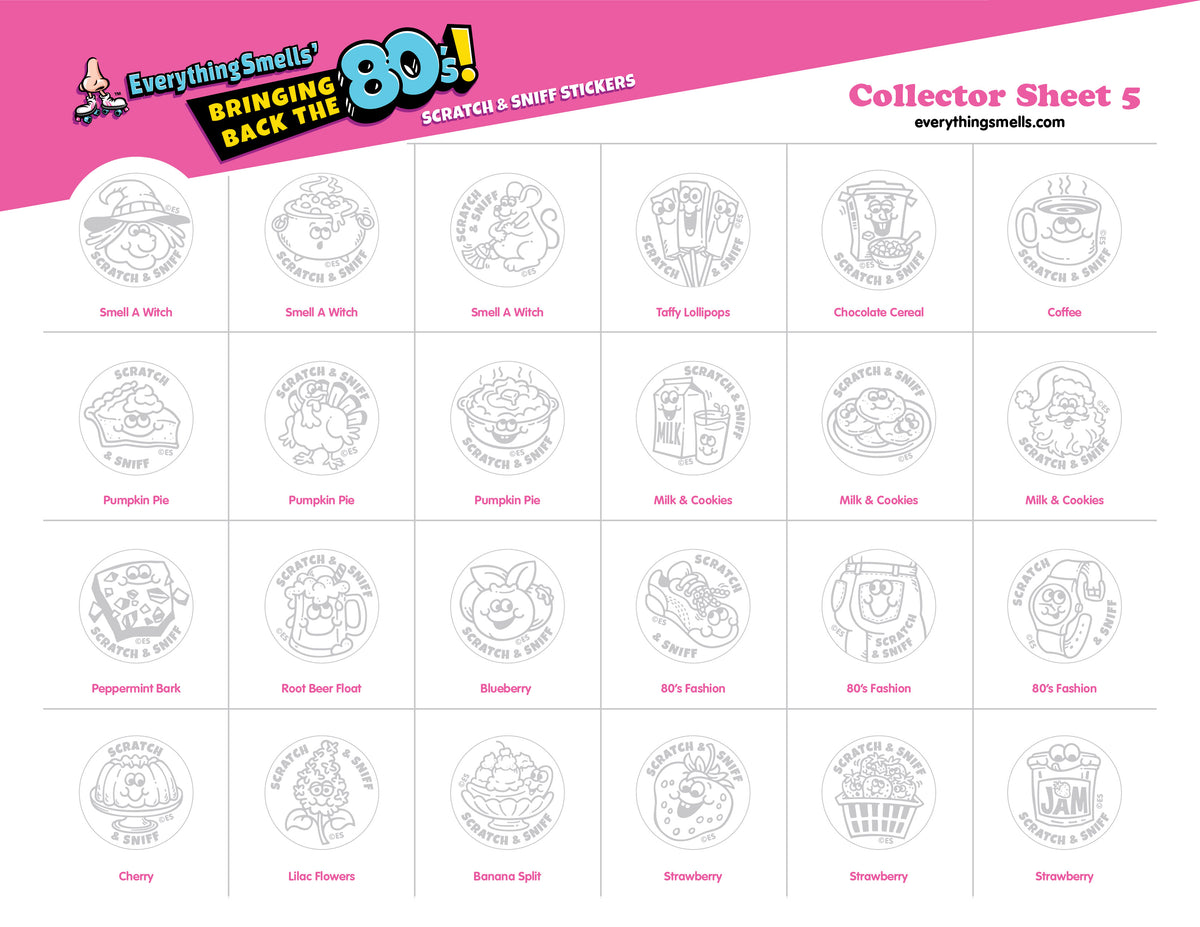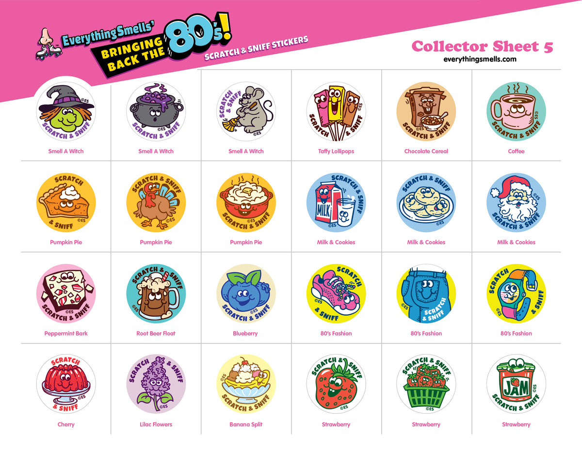 Now you can keep track of your Bringing Back the 80s Scratch & Sniff sticker collection and have some fun sticking your stickers. This 8.5x11 sheet showcases 24 of my sniffs.