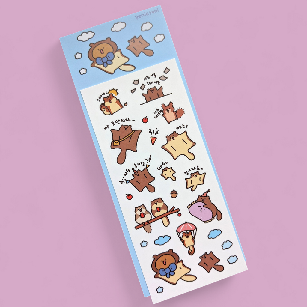 Authentic Korean stickers made by Genie Yoni. They are matte vinyl and feature the cutest characters - Harry & Moon are hanging out with their flying squirrel friends.