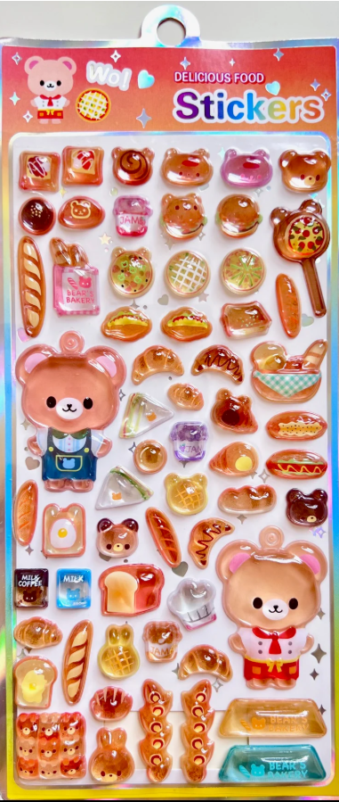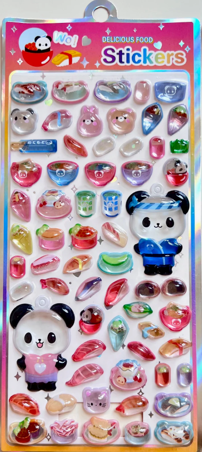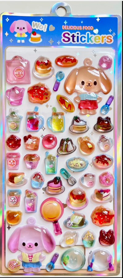These incredibly thick gem stickers look like pieces of colored glass in the shape of food and animals. Each pack comes with 2 animals and a keychain for making your own sticker charm!