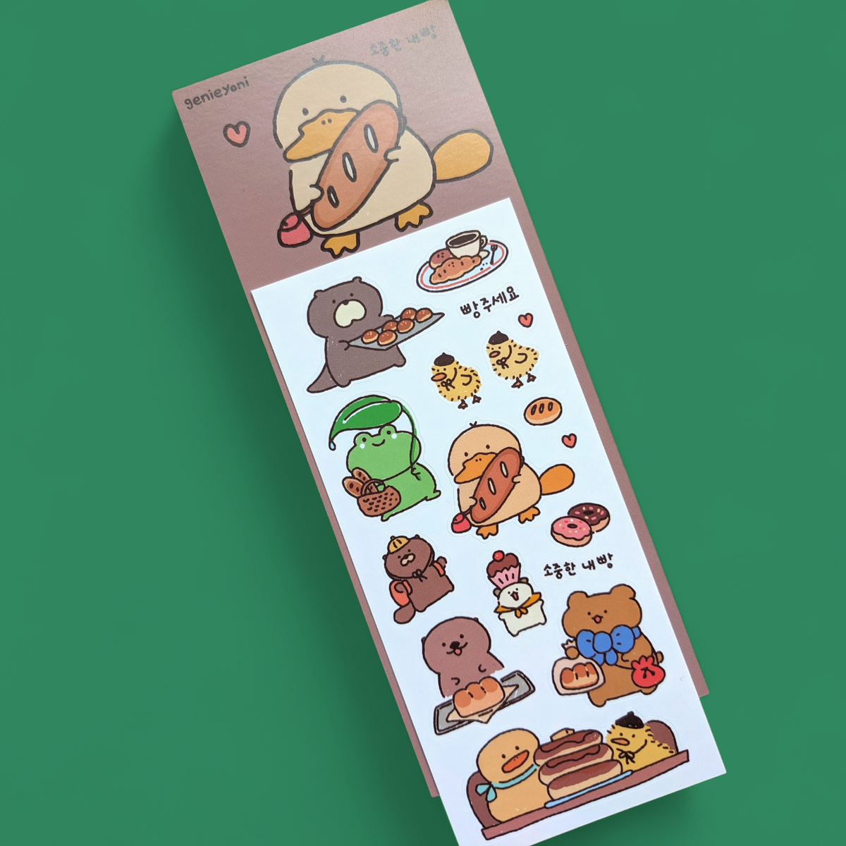 Authentic Korean stickers made by Genie Yoni. They are matte vinyl and feature the cutest characters - Gummy Bear, Harry & Moon Otter, Duck and Frog.
